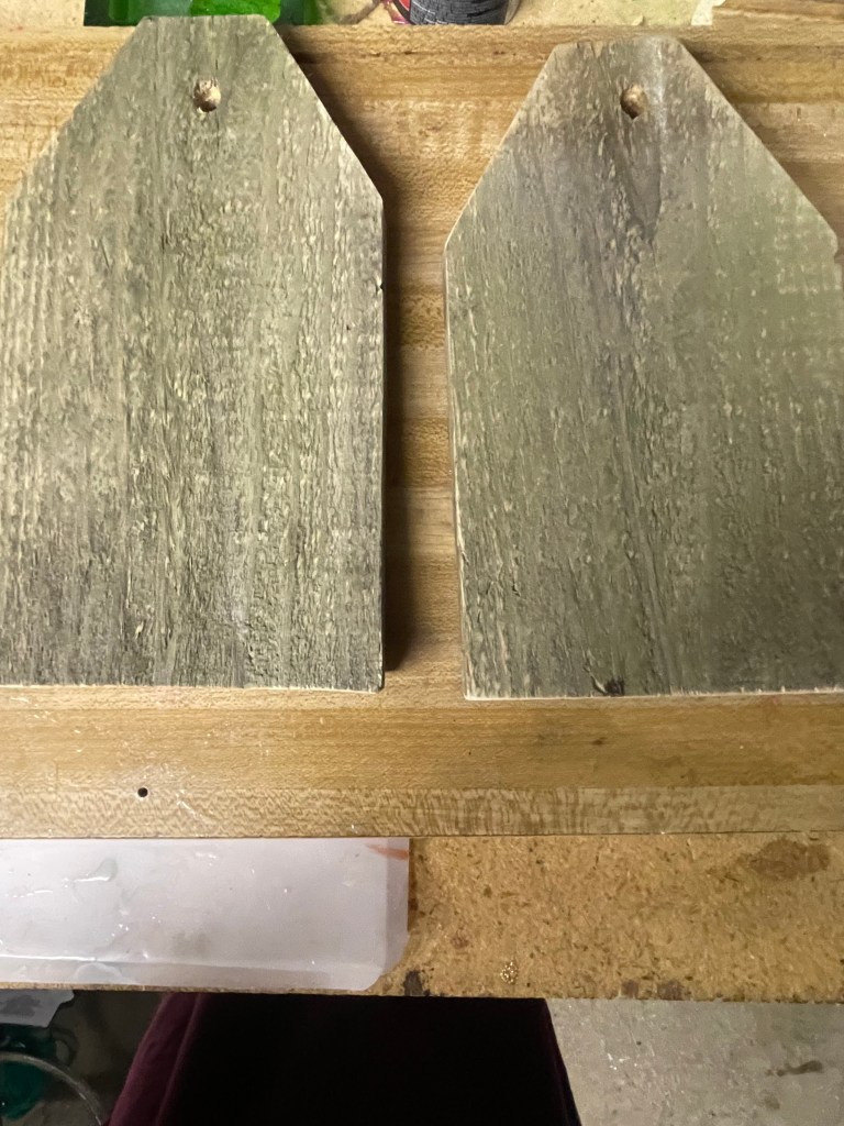 *Wood (I used old barn wood) pick the size you’d like yours to be. Mine are 9”L X 5”W with the top corners a 30 degree angle.