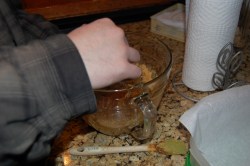 Start by pouring approx. 1 cup of brown sugar into a bowl. Next you will add 1-2 Tablespoons of water. Mix well. Don’t worry, if it ‘s too watery than gradually add a little more brown sugar. You want the mixture to be moist. Wet enough so that when you form a ball, it will hold together. On our first try we accidently put too much water in. Thankfully it was fixable. When you add too much water it ends up looking more like cream of wheat texture. You want it to be packable & if it’s too wet, it’ll be runny and will not hold a shape.