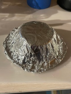 After you have covered your surface, start by turning your bowl (or item of choice) upside down and covering it with the aluminum foil. Normally, when I do projects like this, I use parchment paper. This time I had no problems getting the decorative bowl off the foil without tears.