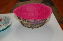 Since I used the squirt bottle, I gently squirted the glue on the paper and brushed as I went. Making sure to get over all the paper that is covering the bowl/mold.