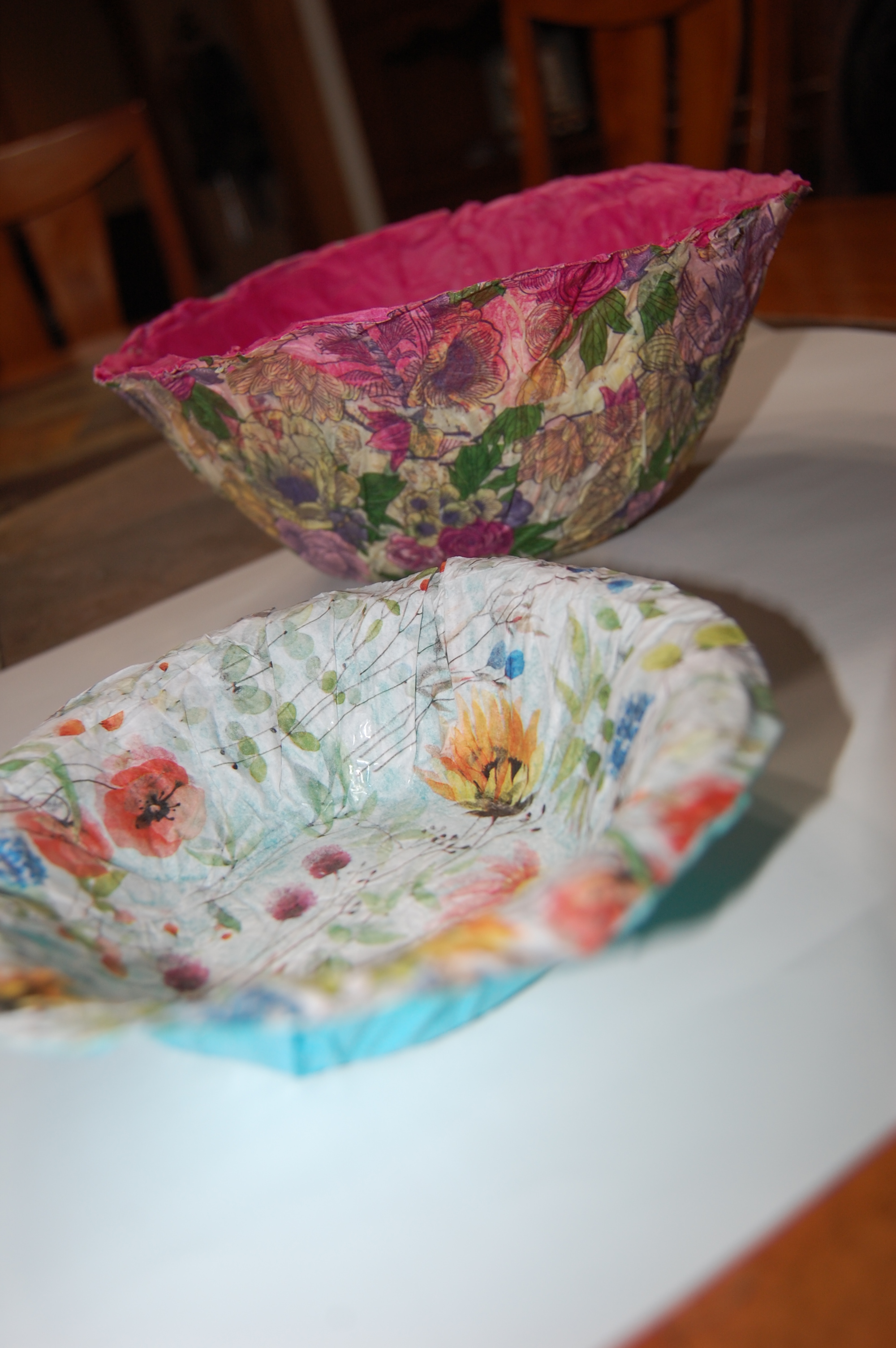 The more layers of napkins and/or tissue paper you use, the sturdier the bowl will be. You can layer then any way you’d like. In my pictures below, I made one bowl using the yellowed flower napkins on the outer side and a solid pink on the inside. Then I did the opposite for the other bowl but using tissue paper.