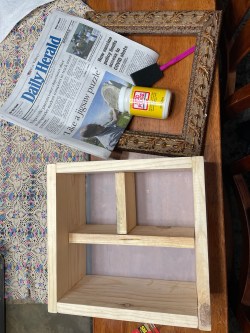 Once you have the wood you need cut to size, you will put the walls of your box shelf together. Sand the pieces before you put them together. When you are finished sanding, spray a little water on it and wipe down with a paper towel or rag to get the dust off.