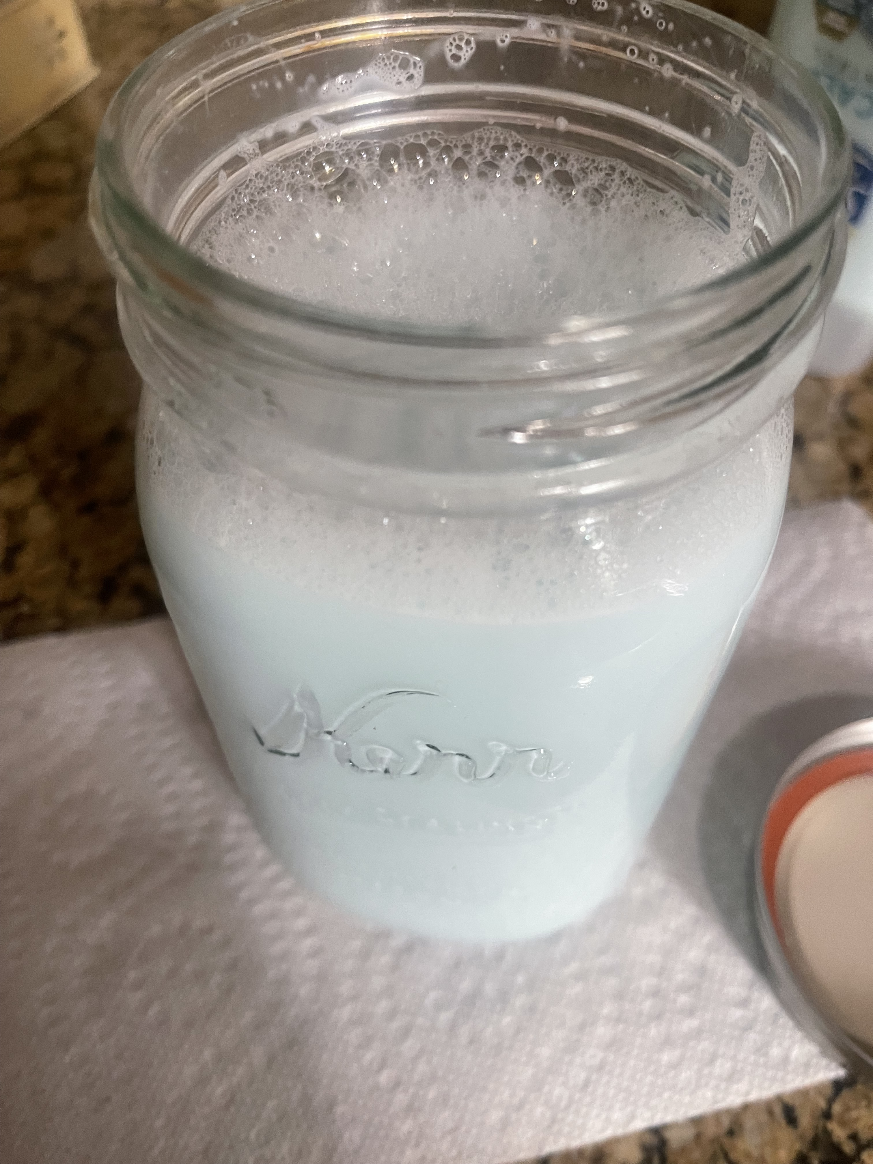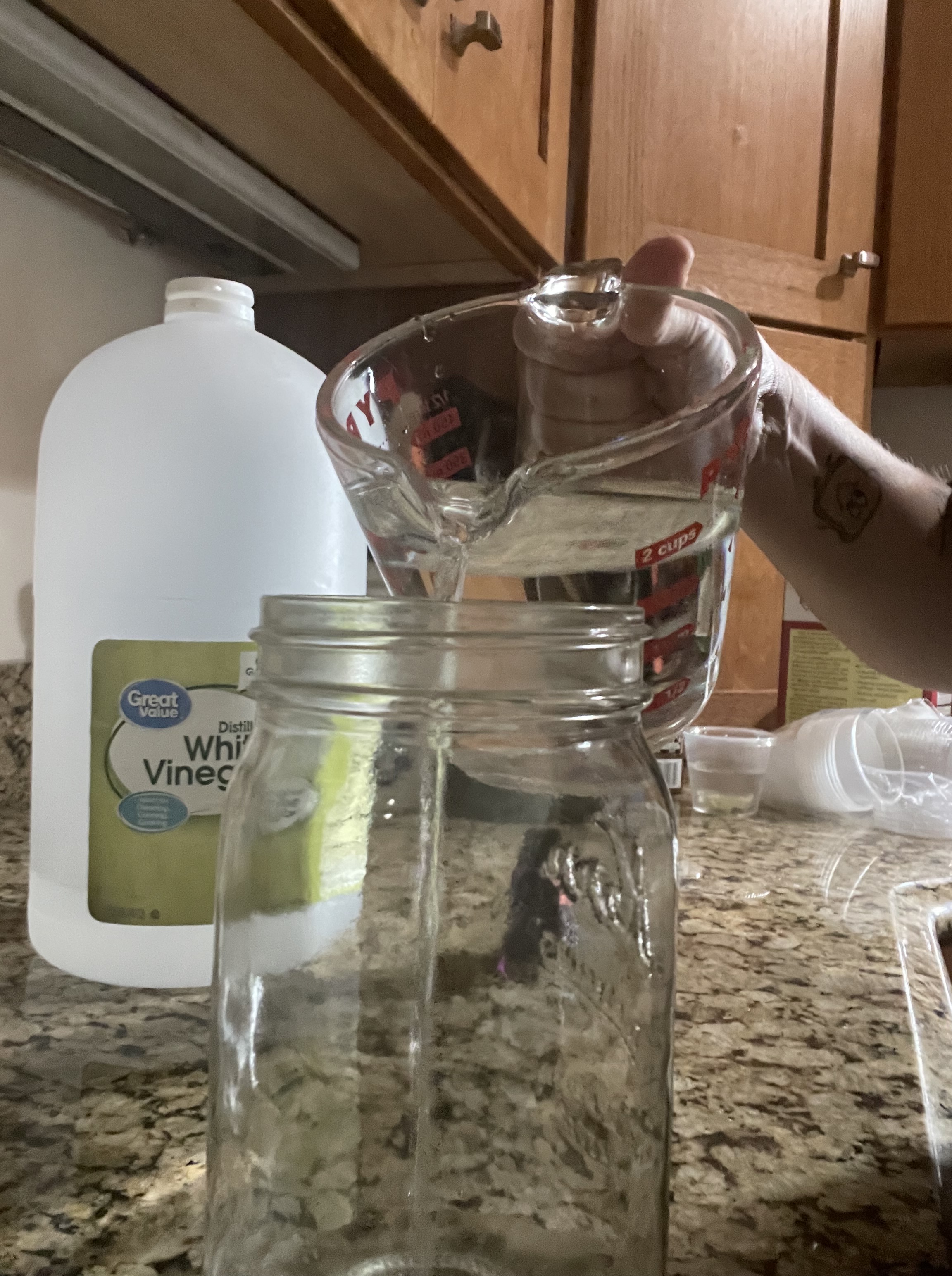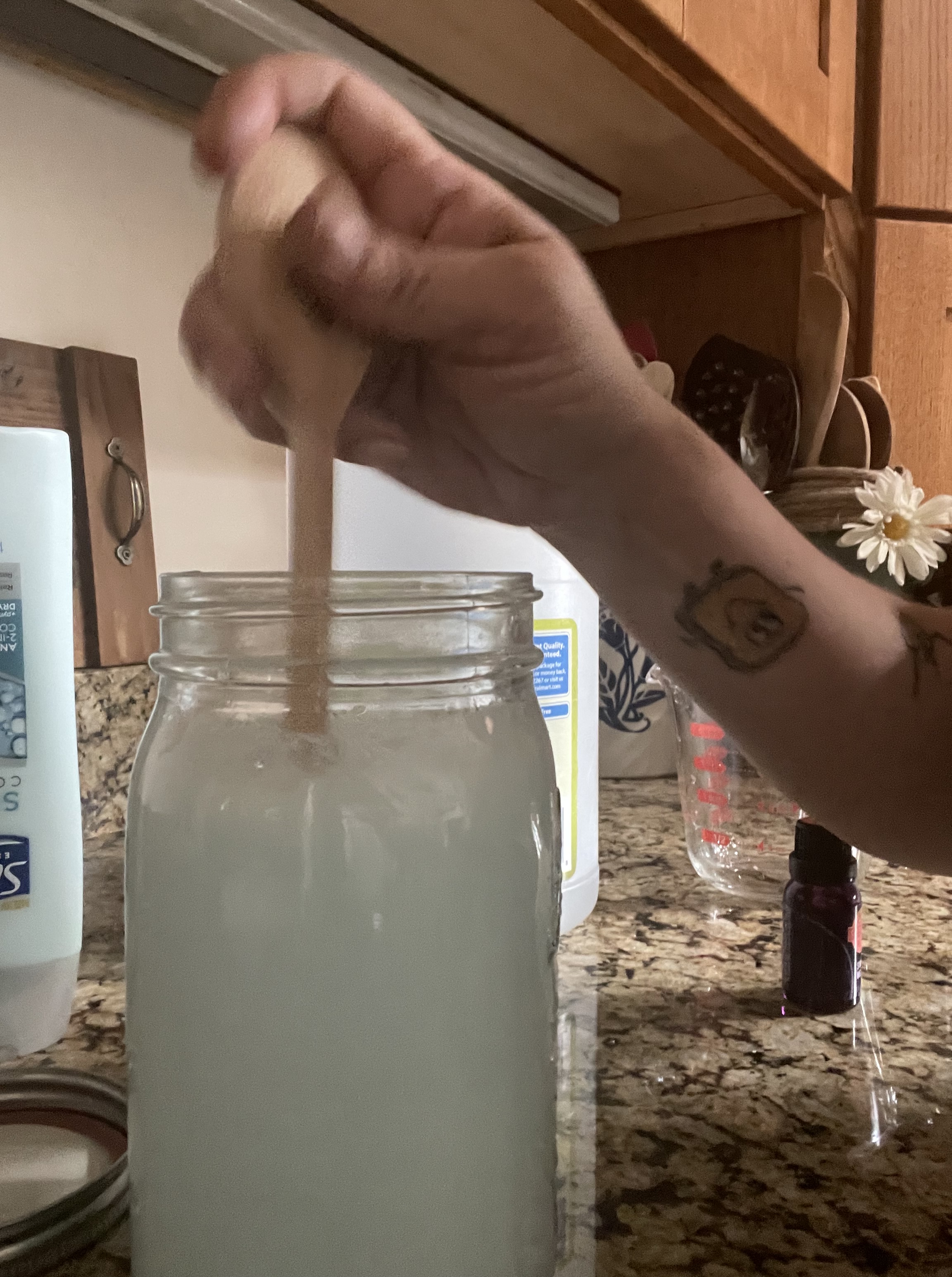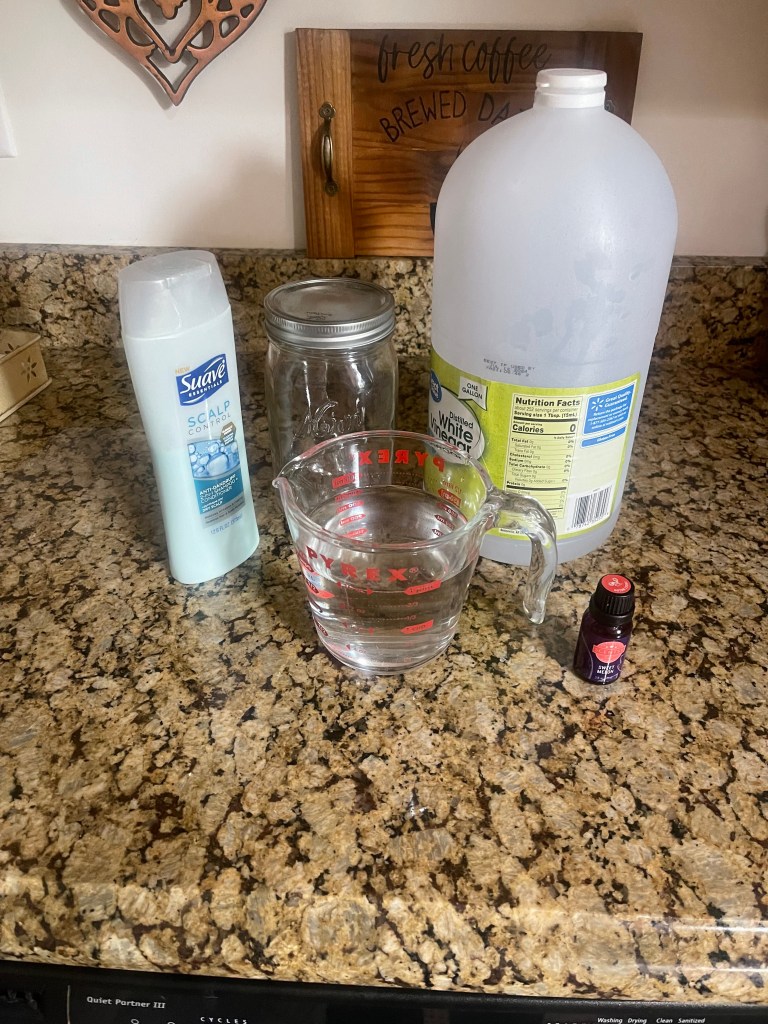 In your jar, put 2 cups of water, than 1 cup of vinegar. Mix. Then add your conditioner. I planned on adding essential oils melon scented but after I added the conditioner it smelled like Downey. So you can add in a few drops of essential oils at this point or skip it. Stir well.