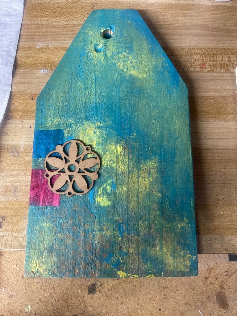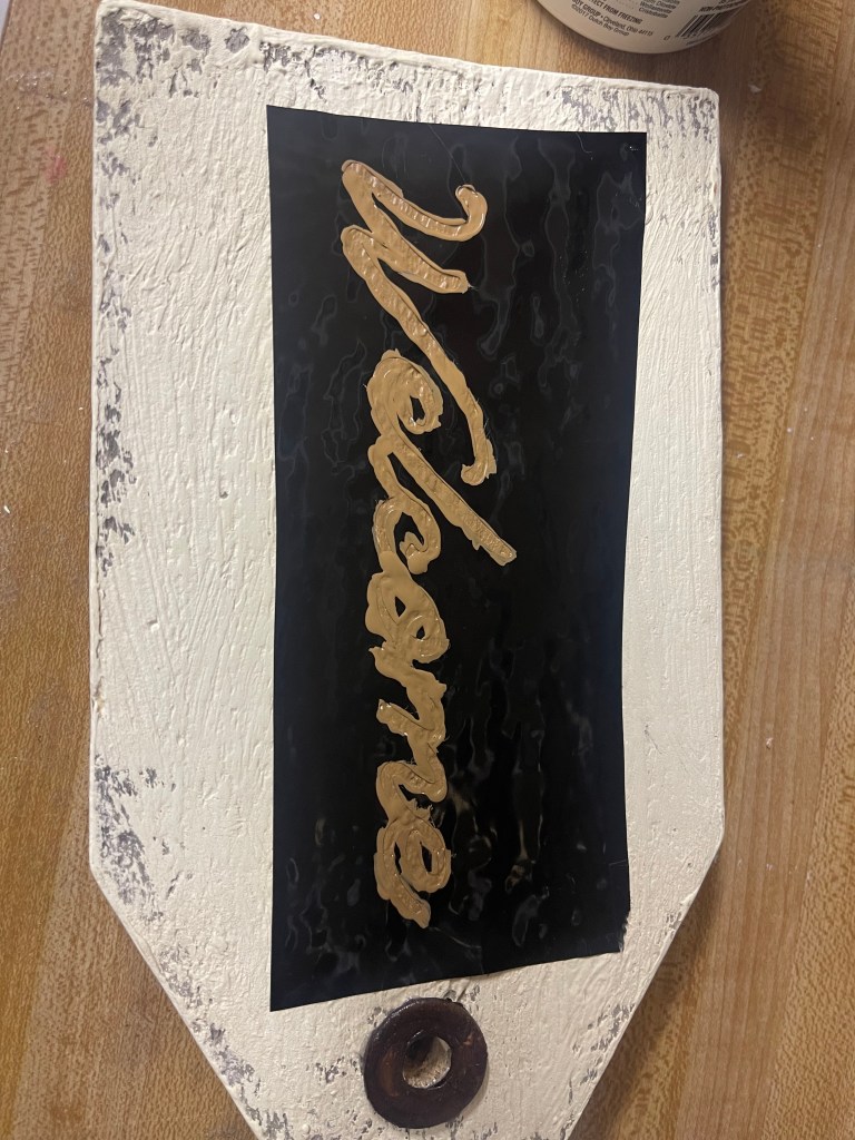 On the other wooden tag, I painted it teal.  Next, I distressed the cream color tag and then used a Dark Espresso color wax on it. Putting it on in areas where I wanted the distressed look darker.  Wiped the wax off and then buff it to give it a shine. When those are dry you can move on to your designs.  On the Teal I used a few colors as you can see in the picture below.  On the cream color tag, I made a stencil with my Cricut Explore and painted the word “Welcome” on it in a medium brown color.