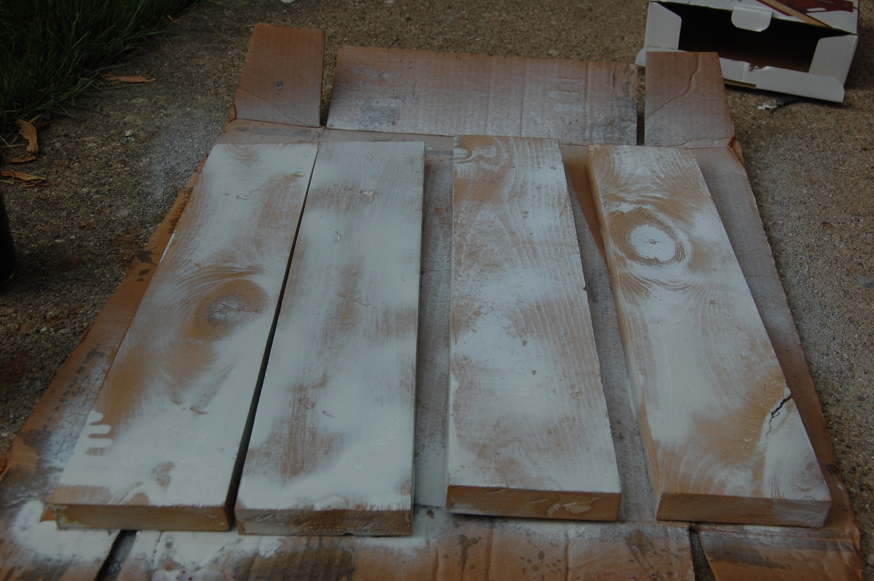 Before I put the paste on a sanded the wood first. I then took the mixture and the wood, I put a cardboard box on the driveway and laid the piece of wood on that. Then you take your mixture and put some on the wood and scrub with your sponge. All sides of the wood. When I was finished I left the wood outside for a couple of hours to let mother nature do her work. The weather seems to play a part on aging the wood. Just leave it in the sun and forget about it for a couple hours. The longer, the better.