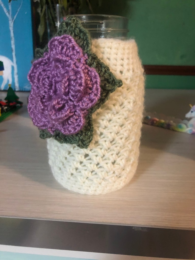 Hi everyone. Happy Friday! Today I thought I would do a post on the Mason Jar Cozy/Vase I made. I have had a few people ask me about it. I’ll admit, I am not good at writing patterns soooo, I have included the links to the patterns from the wonderful ladies who created them!