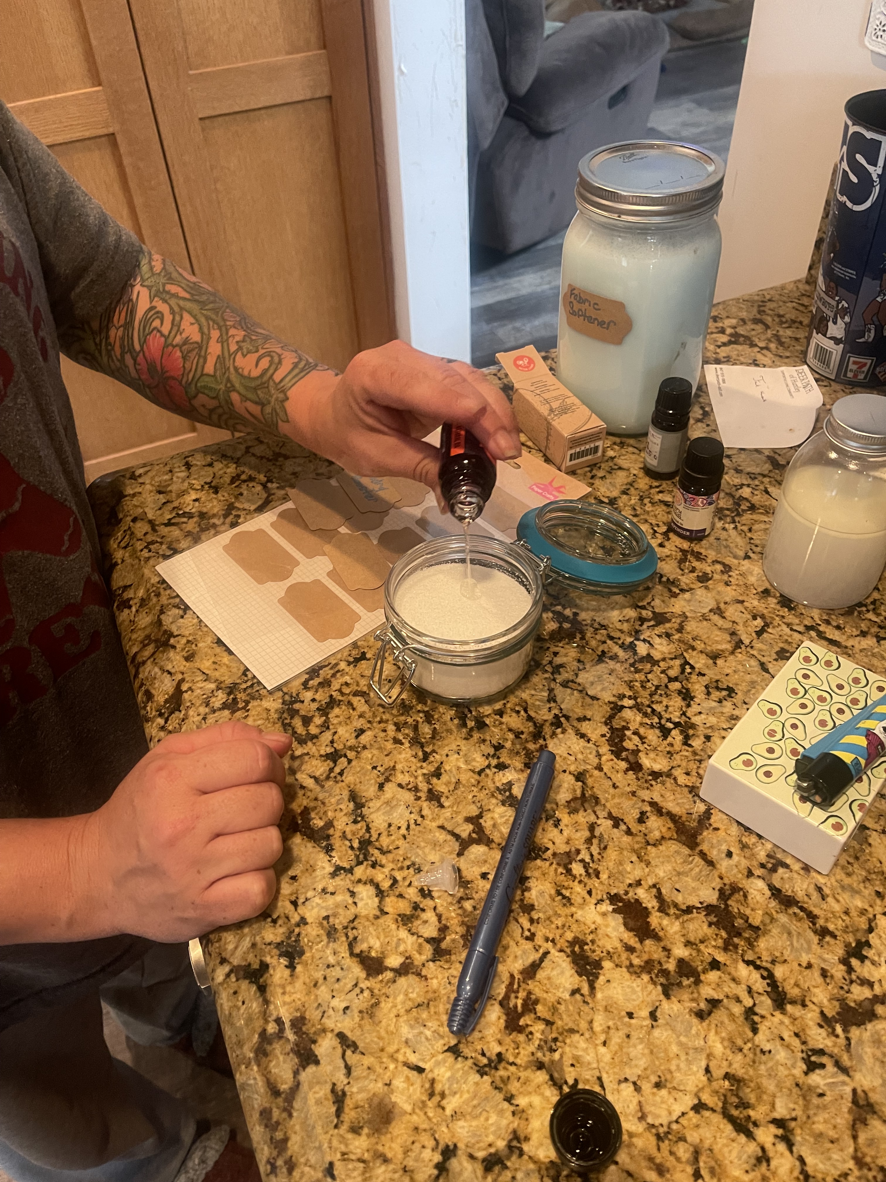 First pour the salt into the jar. The photo above I showed both Kosher & Epsom salt, you can use either one. If you want to make more then what this recipe calls for than add 1 cup, etc. next put your essential oils in. Mix well. After I added the lid on, I shook the jar to give it an extra mix. Voila! That’s it. We use about 1-2 teaspoons in the wash just to give it that extra boost.