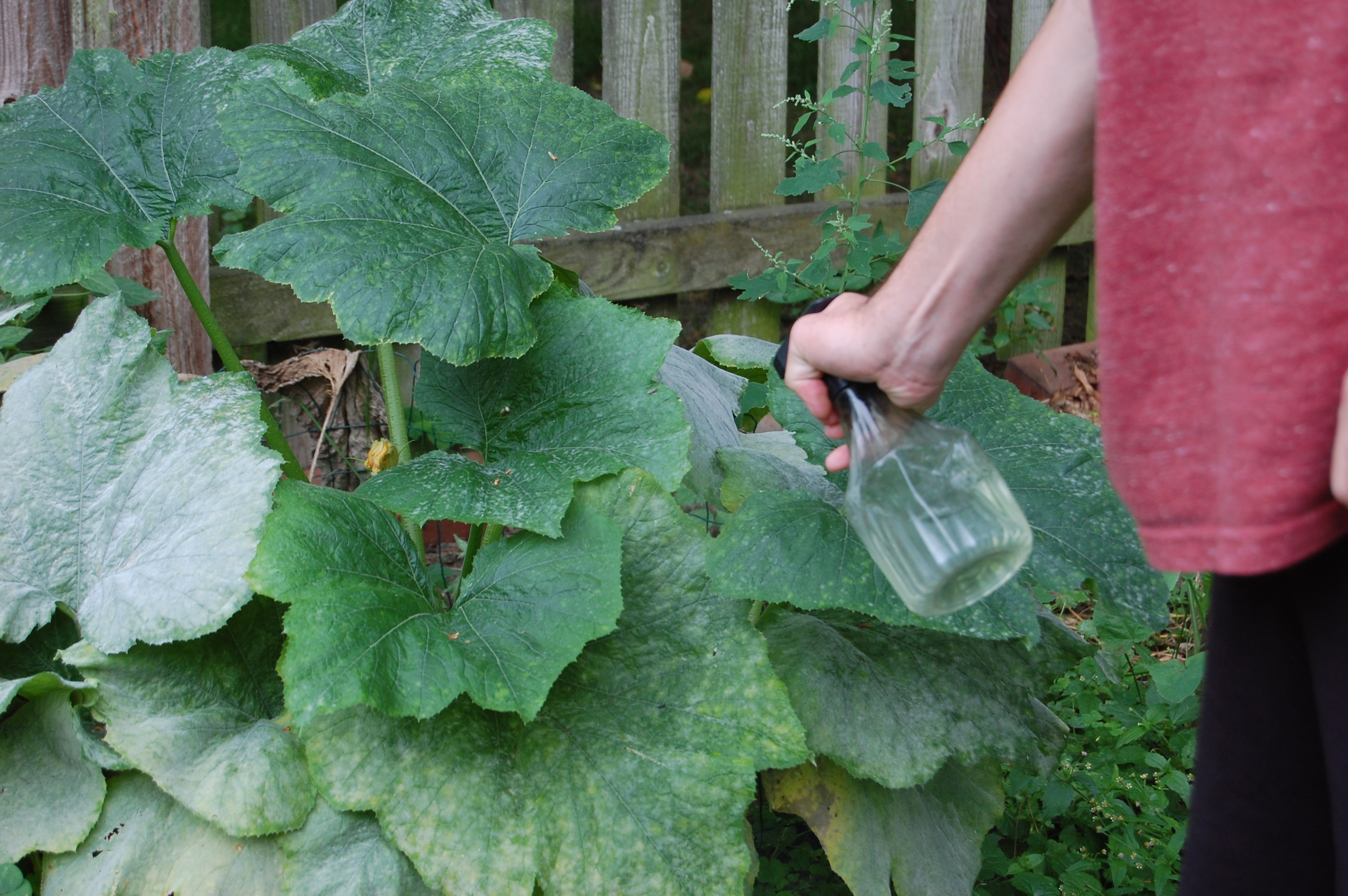 As you can see, my son is spraying the tops & underside of the leaves thoroughly. The treatment is working on my zucchini plants. It is a slow process & will take a couple weeks. Just glad we caught it before the fungal infection took over. Treat the fungal infection as soon as you notice it. If not treated it can spread and kill your plant