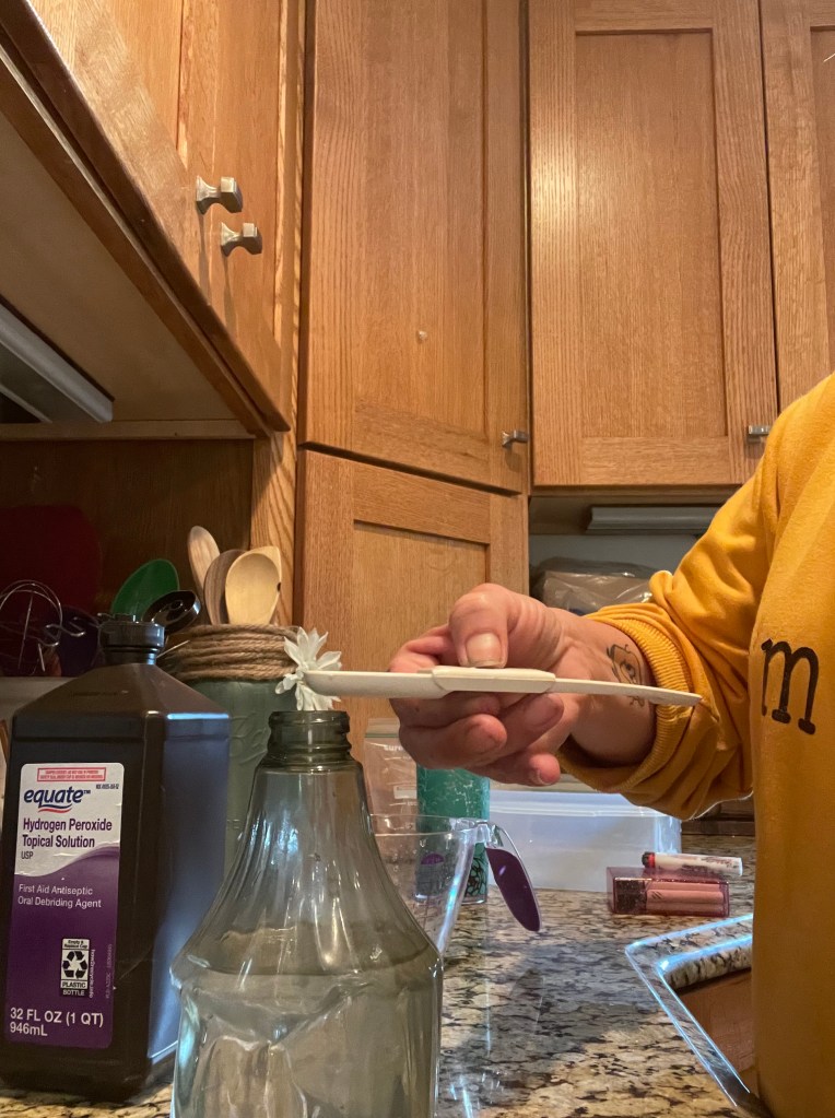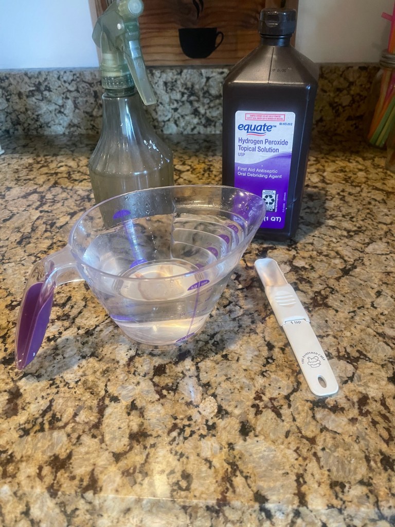 I filled the spray bottle approx.. half full with water. Then add 1-2 Tablespoons of Hydrogen Peroxide. After the Peroxide is added, you will add 1-2 teaspoons of rubbing alcohol. Next is the dish soap, no it does not matter what kind of dish soap you use. I used Mrs. Meyers dish soap. Put the lid on tight and shake well to mix everything up.