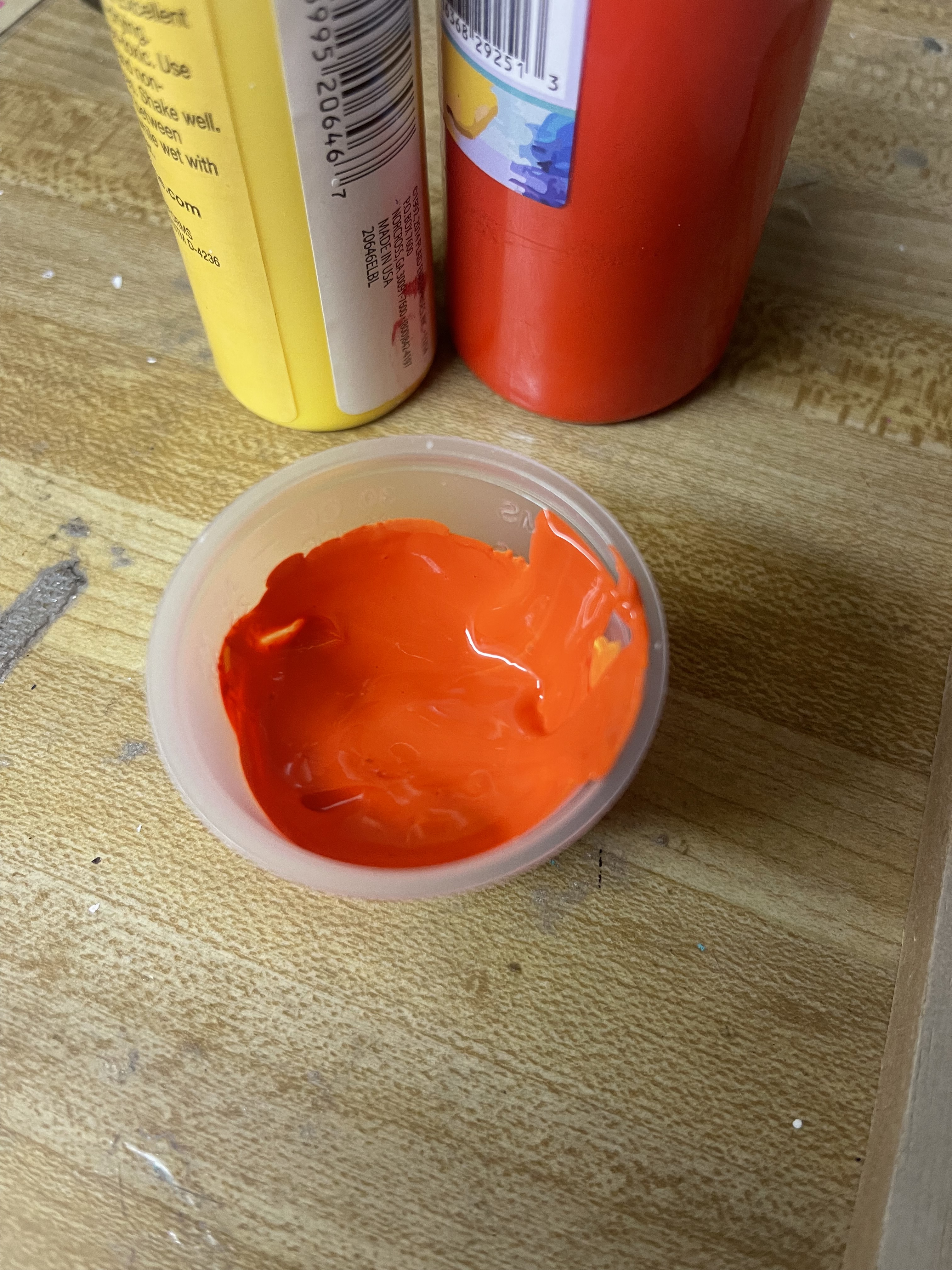 You want to start by sanding your wood down. Make sure it’s smooth & no splinters sticking out. After that You can paint your pieces. I do not have orange paint. So I made some. For me, it’s easier to paint the Top, than bottom, then sides chasing drips as I go. Make sure you are allowing your pieces enough time to dry.