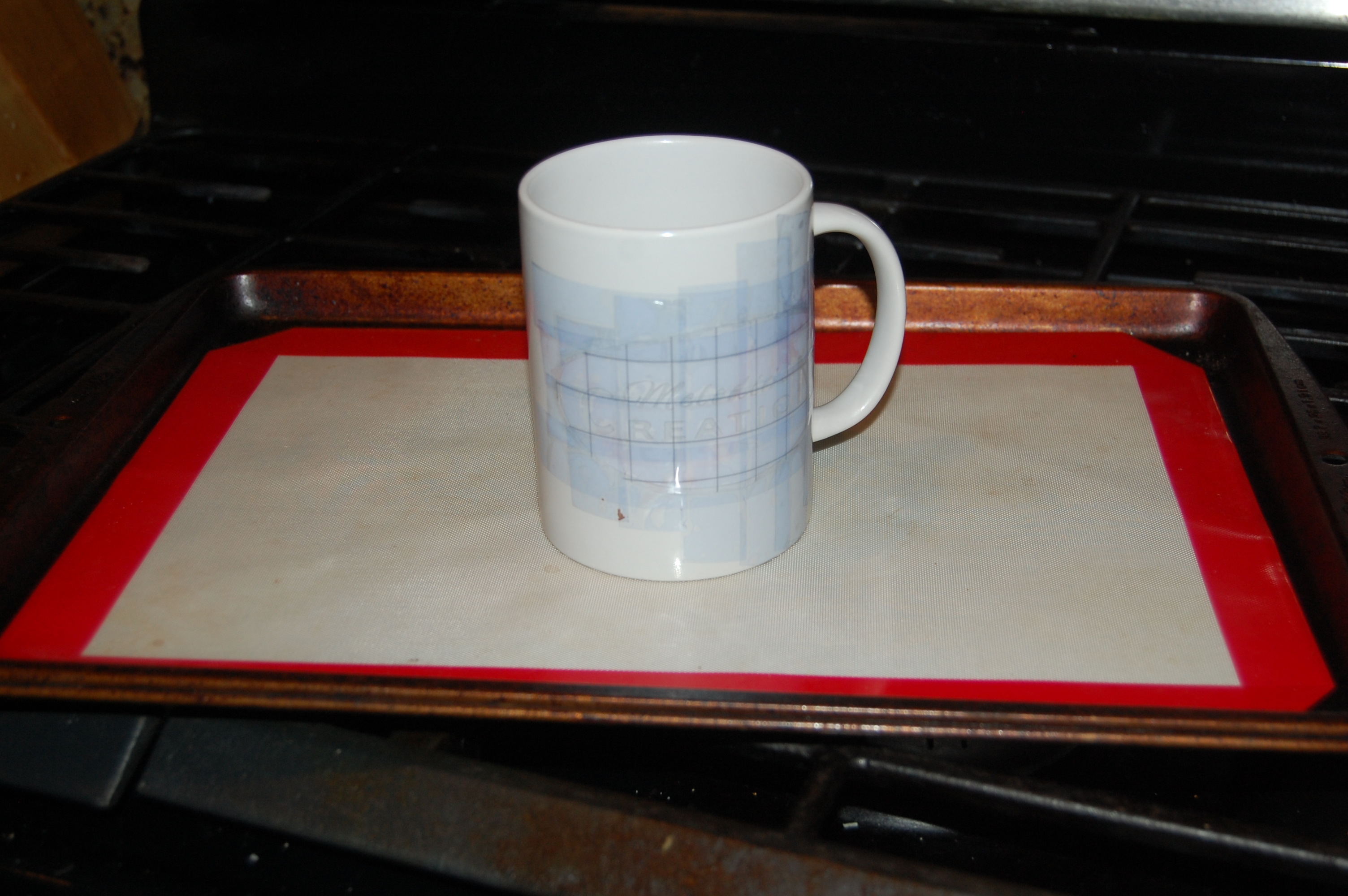 Put a rubber silicone mat on a cookie sheet, just to protect the mug from sliding. Then put the mug on top of the mat & cookie sheet and put it in the preheated oven for 15 minutes. After the 15 minutes are up, turn the oven off and leave the mug in the oven for about 5 minutes to cool down. After 5 minutes or so take it out of the oven to cool off completely. In the picture below, this is what it looks like right out of the oven. You see the image is colored.
