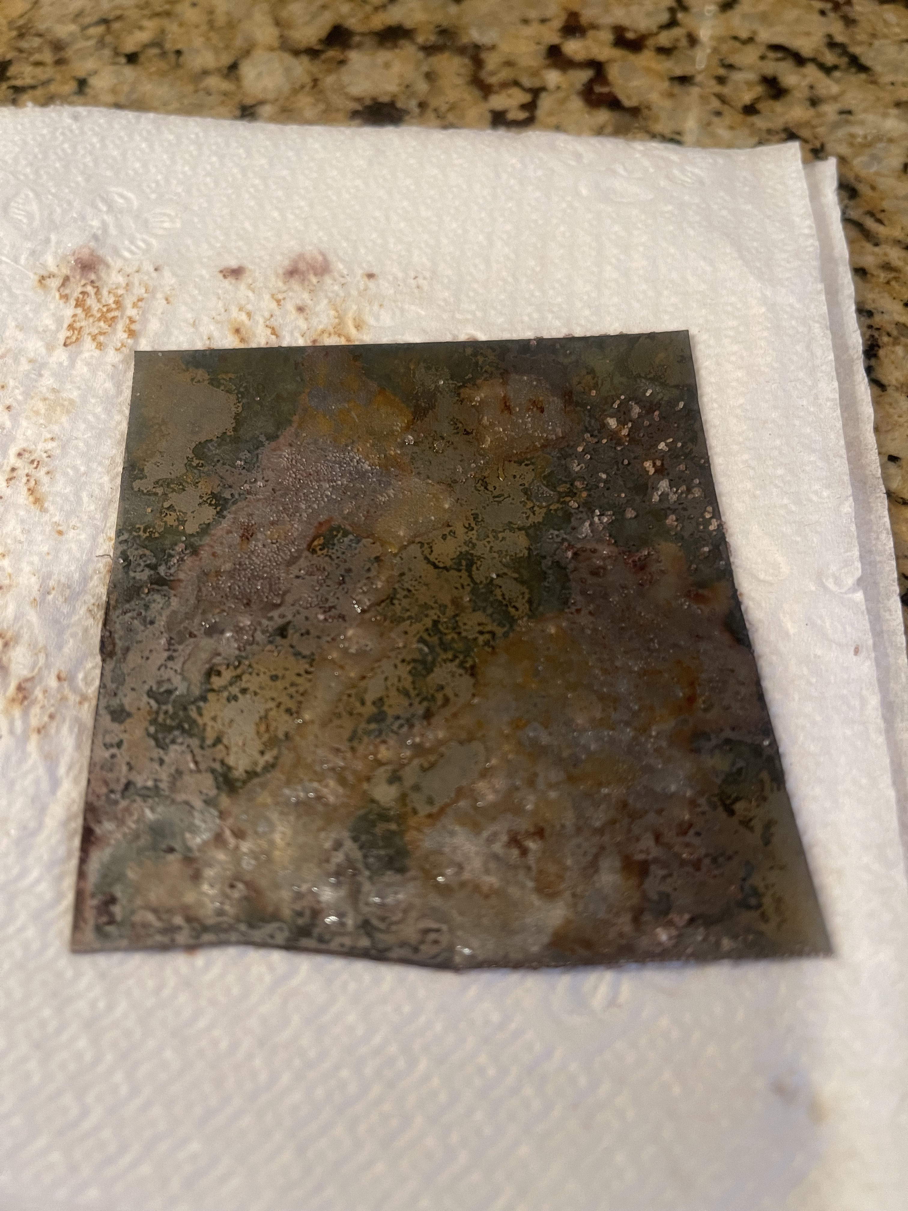 Once your vinegar/salt mixture is ready, carefully put the copper pieces in the mixture for 30-40 minutes. Remove the metal from the bowl and place on a paper towel to dry. You will want to leave the vinegar/salt mixture on it. Set your timer for about 1 hour. When the time is up, you should start to see a little bluish green color. Mine had very little color on it so I turned mine over, which I’m glad I did becuase there was quite a bit of color on that side. So I sprinkled a little more of the vinegar/salt mixture on it and let it sit for another 30min-1 hour. Here’s my results –