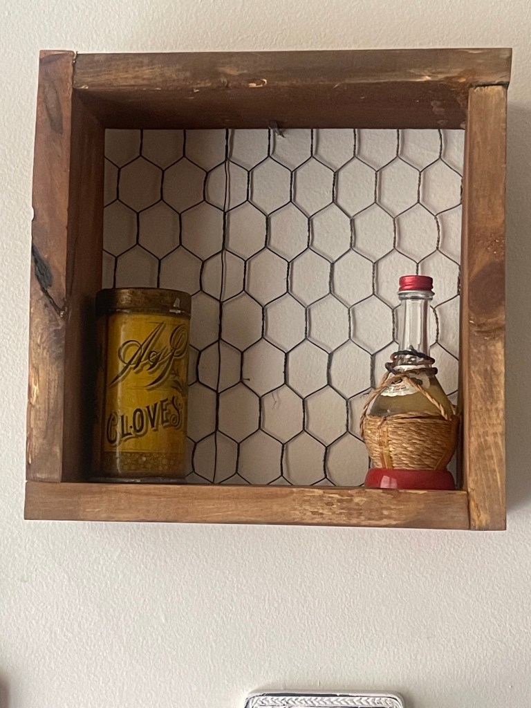 Farmhouse shelf. I aged the wood, used my homemade stain and finished it off with chicken wire for the back.