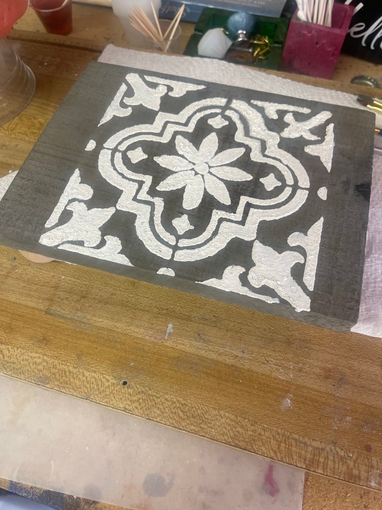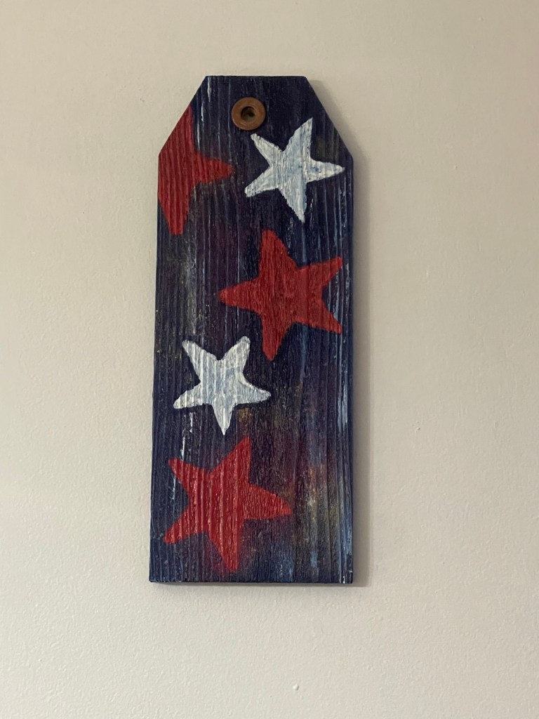 Wooden Tags- Used Fusion’s clear wax and Cricut vinyl stencil.
