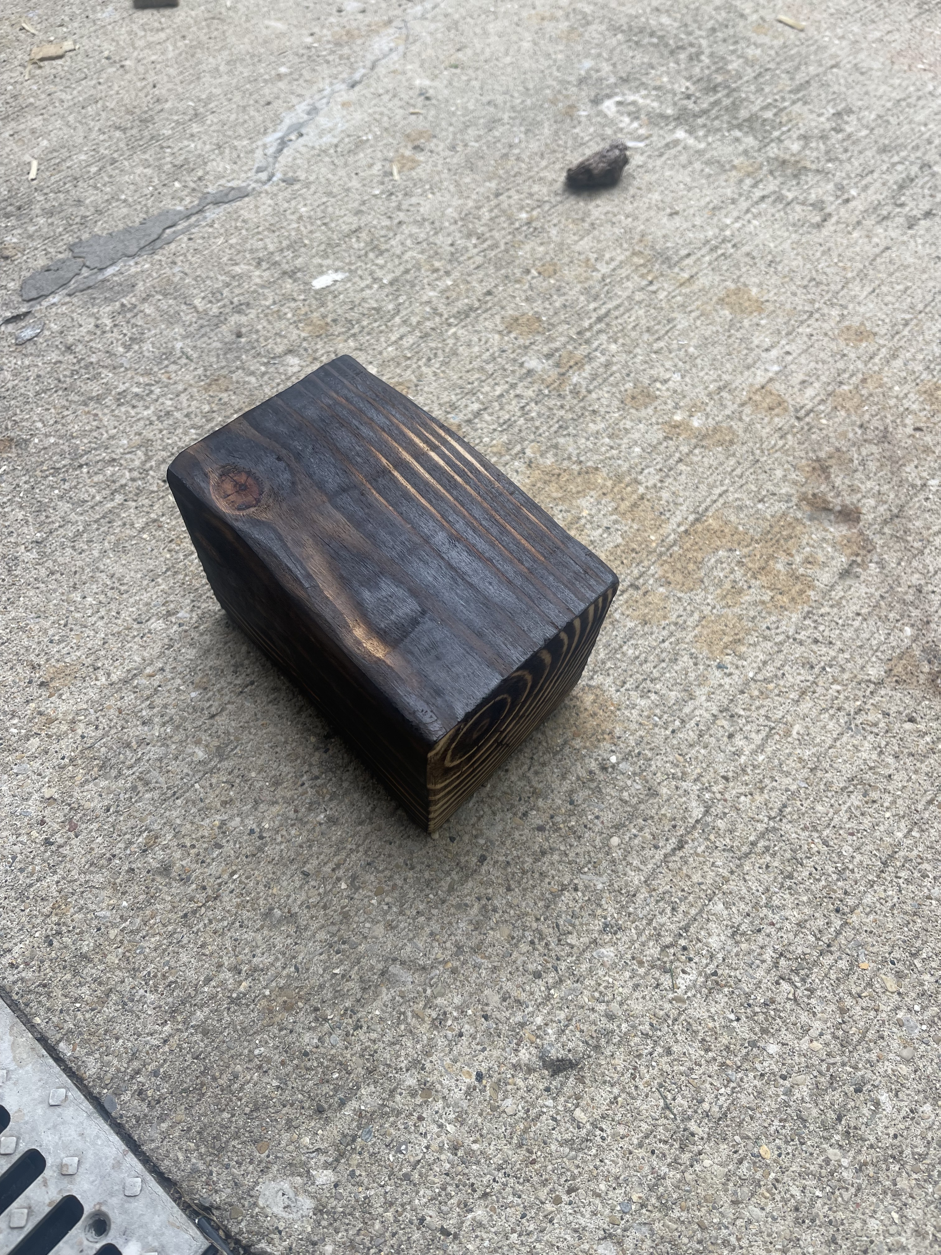Once cooled, bring it to your sander and start sanding. Now I made 2. One of them I sanded too much & the other I sanded just enough so the burn marks were on the grains of wood.