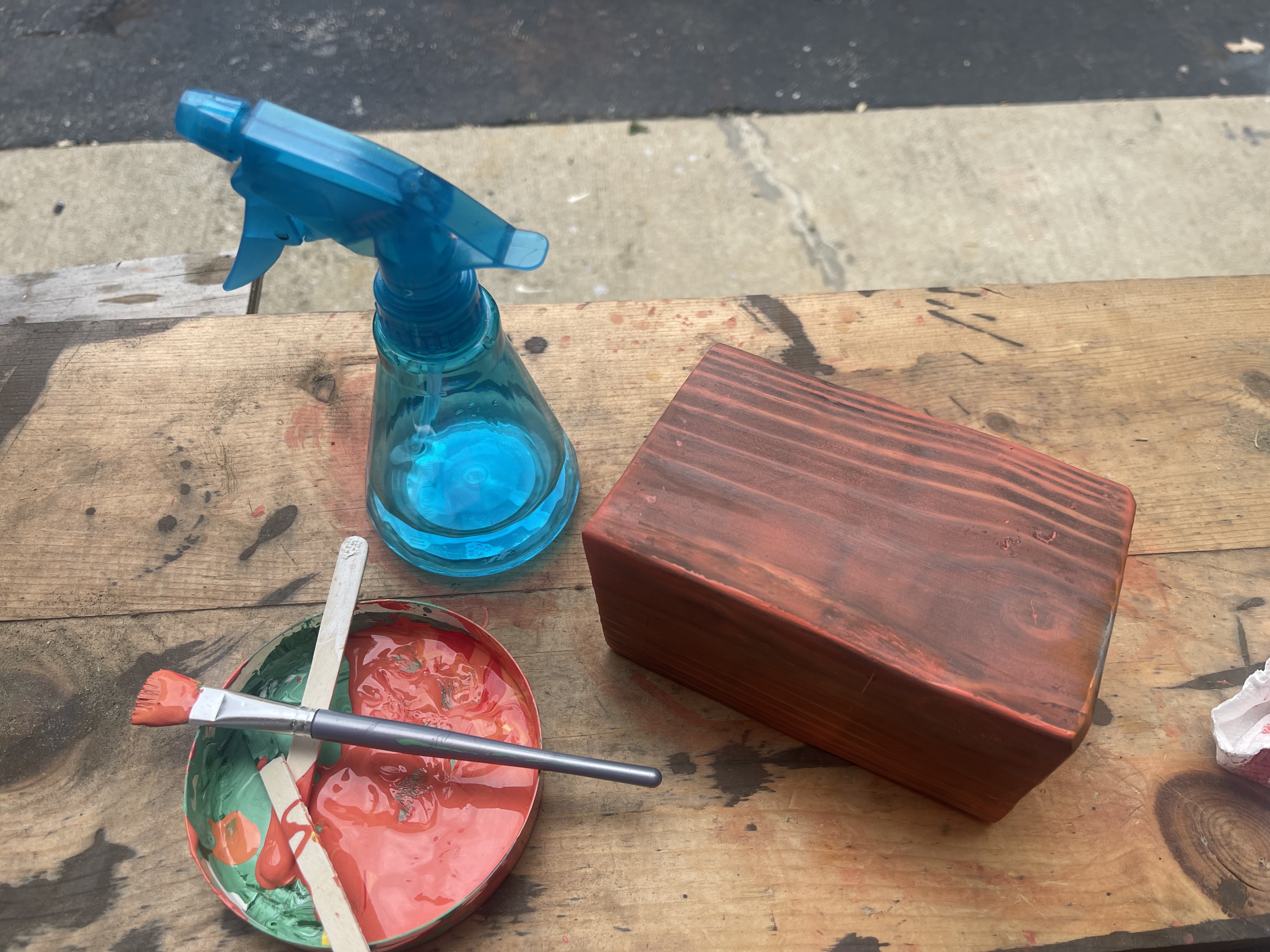 Once the sanding is complete, dust it off with a rag. I spray the rag with a little water and wipe it down that way. Now You can begin painting. I painted like a white wash but with a medium orange color. I put some paint on, then sprayed it with water a little bit and then wipe off with a rag or paper towel. You will keep doing that until the color is how you like it.